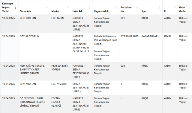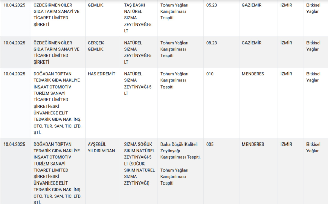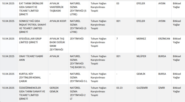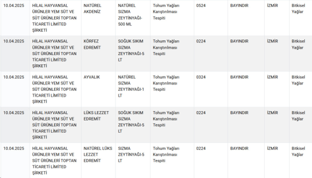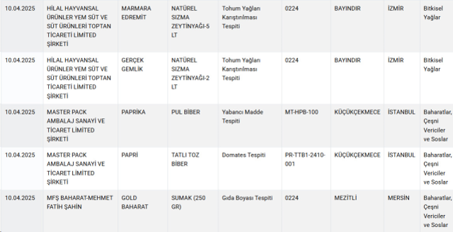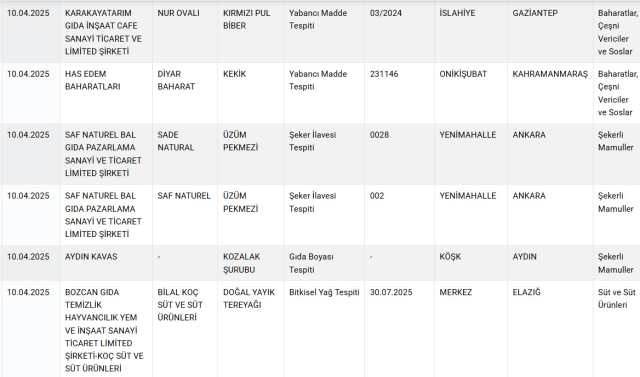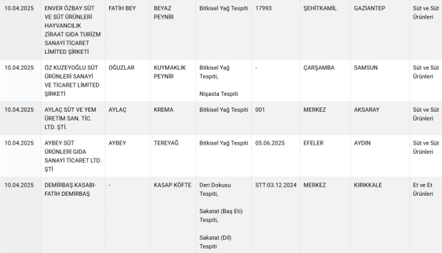 Listede, yağ, yoğurt, peynir, pekmez, baharat ve şarküteri eserlerinde önemli usulsüzlükler tespit edildi. Bilhassa kimi köfte eserlerinde lisan ve baş eti, kıymalarda ise tek tırnaklı hayvan eti kullanıldığı ortaya çıktı. Ayrıyeten, birtakım baharatlarda besin boyası üzere yasaklı hususlara rastlandı.