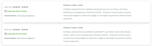Etkilenen Cadde / Sokak İSTANBUL BAHÇELİEVLER ilce MERKEZ-CUMHURİYET mah ATMACA, BEYZADE, BÜLBÜL, DUMLU, KEKLİK, SEFA sk bölgelerinde 11/04/2025 10:00:00 – 11/04/2025 13:00:00 saatleri ortasında Abone/Şube İlişkisi Sebebi ile İş Sıhhati ve Güvenliği’ni de gözeterek elektrik kesintisi yapılacaktır.