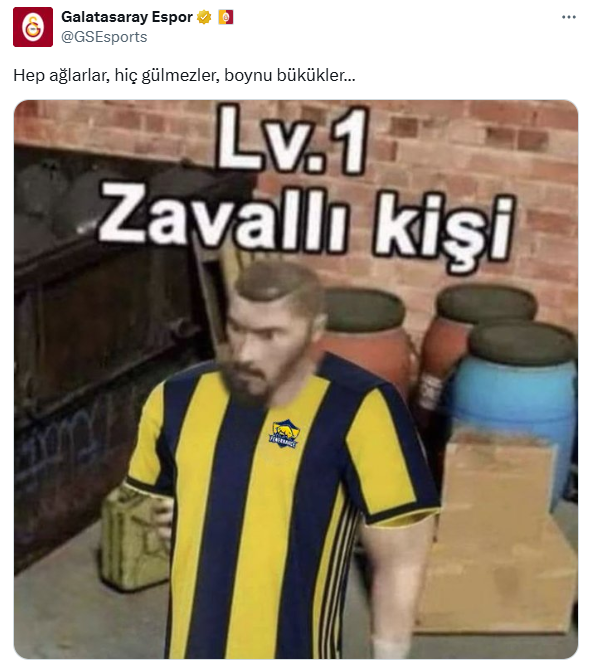 Galatasaray Espor’un resmi X hesabından yapılan paylaşımda Fenerbahçeli formalı ve üzerinde “Lv.1 Zavallı kişi.” yazan bir görsel kullanıldı ve “Hep ağlarlar, hiç gülmezler, boynu bükükler…” notu düşüldü. Bu paylaşımlar kısa müddette viral oldu.