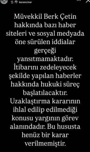 Haberlerin sansasyon yaratmasının akabinde Berk Çetin toplumsal medya hesabından avukatı aracılığıyla bir açıklamada bulundu: “Müvekkil Berk Çetin hakkında birtakım haber siteleri ve toplumsal medyada öne sürülen tezler gerçeği yansıtmamaktadır. Prestijini zedeleyecek halde yapılan haberler hakkında süreç başlatılacaktır. Uzaklaştırma kararının ihlal edilip edilemediği konusu yargının vazife alanındadır. Bu konuda şimdi bir karar verilmemiştir” diyerek argümanları yalanladı.